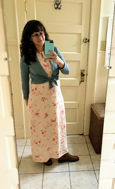 This is a vintage 1990s Liz Claiborne linen dress, bought on Ebay – size 10, so I had to take it in a bit under the arms (and might actually continue my little seam down a little farther, to reduce the small pucker that's left in the bodice). It's sleeveless and rather sheer, so that even in hot weather I'll need to wear it with a full slip or a cami and half-slip. We'll see whether that translates to wearing it less in really hot weather or not. I love the duck-egg blue of this thrifted Loft cardigan with the tender pink of the dress – have been looking forward to wearing these colors through all the long weeks of wearing purple. Though obviously I can wear this dress with sandals, it looks nice with boots as well, so will be a good all-season piece.