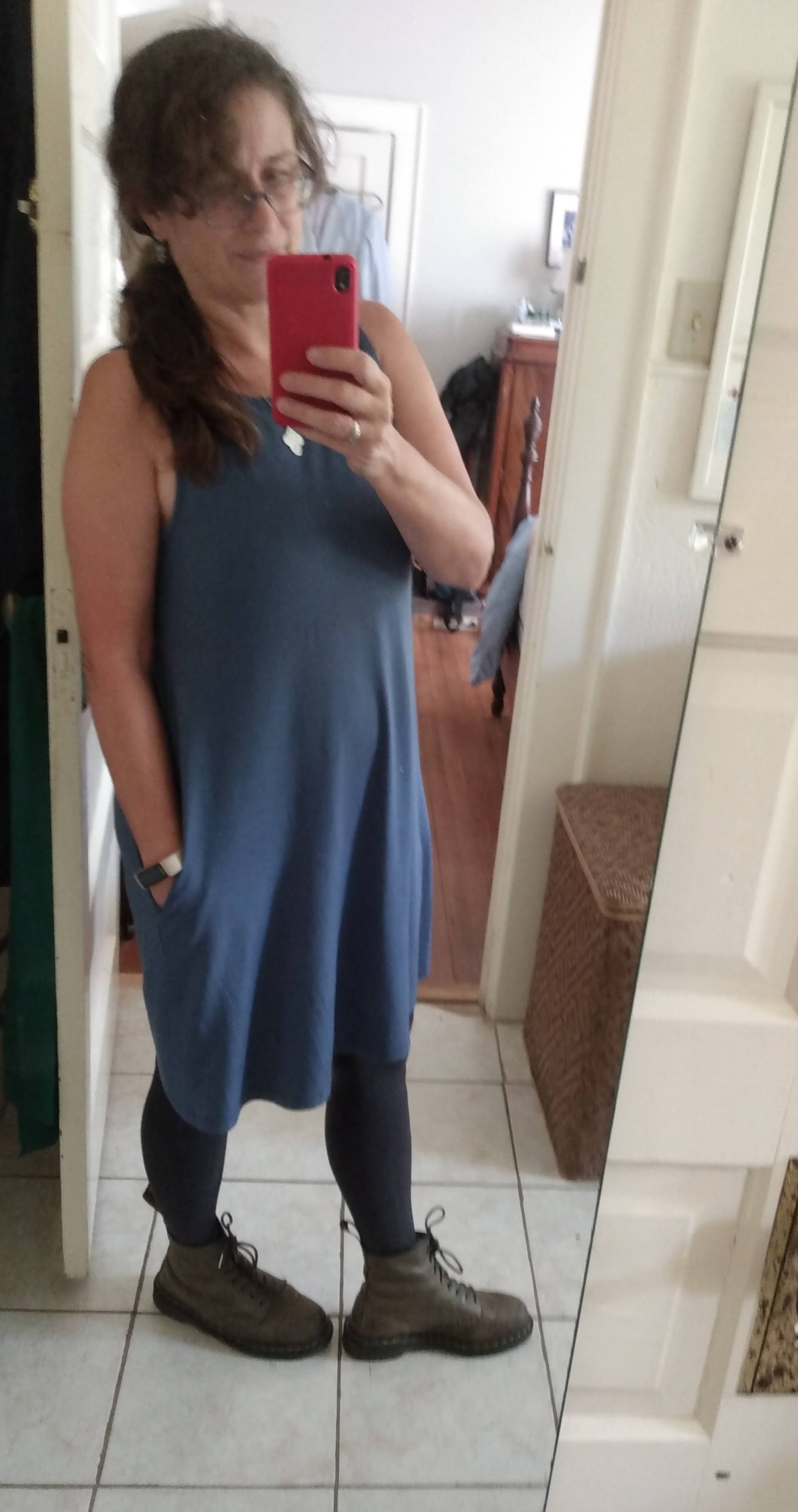As you might recall, yesterday I tried a core outfit of this Wool& Camellia lapis-blue dress plus a gray beaded cardigan with a variety of boots and tights, to see how many different outfits I could achieve.