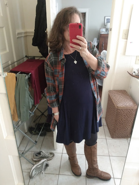 So, with one dress-tights-boots base, I've made, let's see, how many discrete outfits? A bunch, that's how many. For a secondhand dress that cost me $12, this is not bad at all. The dress itself is so soft and comfortable, in breathable, thermally-regulating bamboo fiber. It's a complete outfit on its own –– in warm weather I would totally wear it in "team basic" mode with a pair of sandals. I would absolutely wear it to hike in cooler weather, with leggings and whatever outer layers I needed. I'm really happy with its ease and versatility, to dress up or down. While I've left a couple of other navy dresses hanging in my closet for now, it will be interesting to see how much I reach for either of them compared with how often I might reach for this dress.