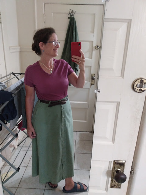 The challenge also meant that I got more wear out of my merino tees than I had been getting. Here's my Ibex grape/pink tee with, again, sage green: this long thrifted twill skirt. I'm glad to have gotten around to putting these elements together, and I really liked the outcome.