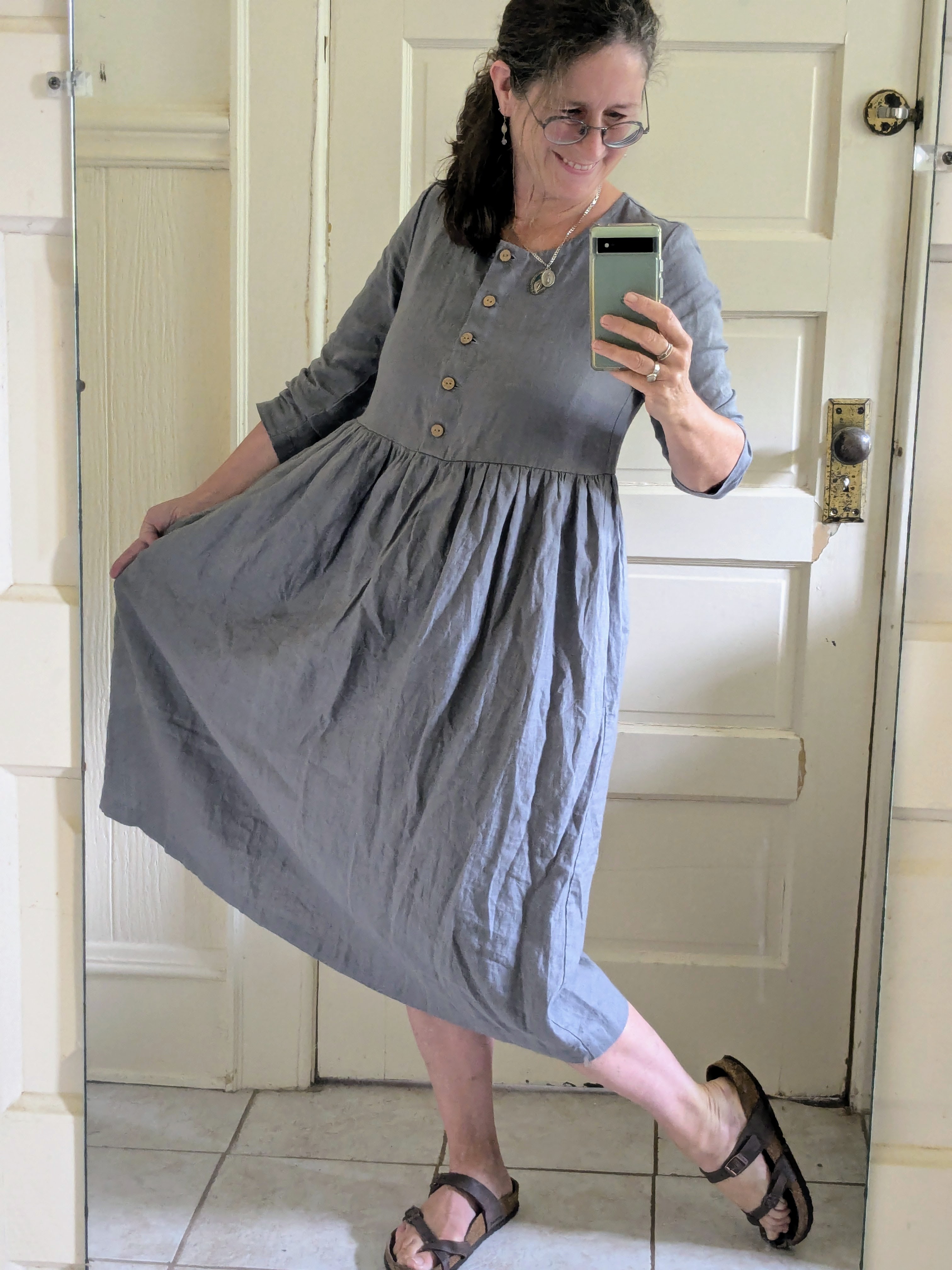 Meanwhile, I love the look. I appreciate the forgiving nature of these dresses, with their skimming shape that nevertheless provides some clear waist definition. I appreciate that this soft linen has flow and fluidity, but some structure, too --- it's never going to look droopy or stretched out, as (I hate to admit it, but photos don't lie) my Wool& swing dresses can do. I like that this dress has some beautiful tailoring, yet it still gives grace to my body, with its round belly and its various sags and droops.